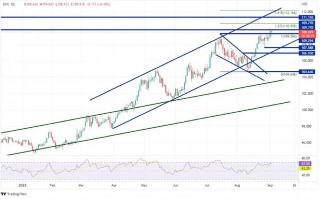 从技术面上看,美元指数自2021年5月以来有序走高并形成上升通道(绿色线),今年4月21日站上通道的上轨趋势线100.00附近并开始形成更加陡峭的上升通道(蓝色线),在7月14日击穿该通道的上轨趋势线,创下2002年9月以来最高点109.29。当价格未能突破通道一端时往往朝另一端测试,美元指数也是如此,其回撤并形成下降楔形,于8月11日到达通道和下降楔形的下轨,即104.63低点。