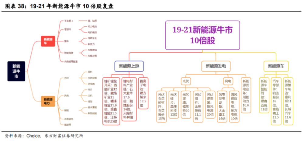 东方财富证券的分析师曲一平认为,新能源牛市中的十倍股遍布该赛道的上中下游,他具体分析道: