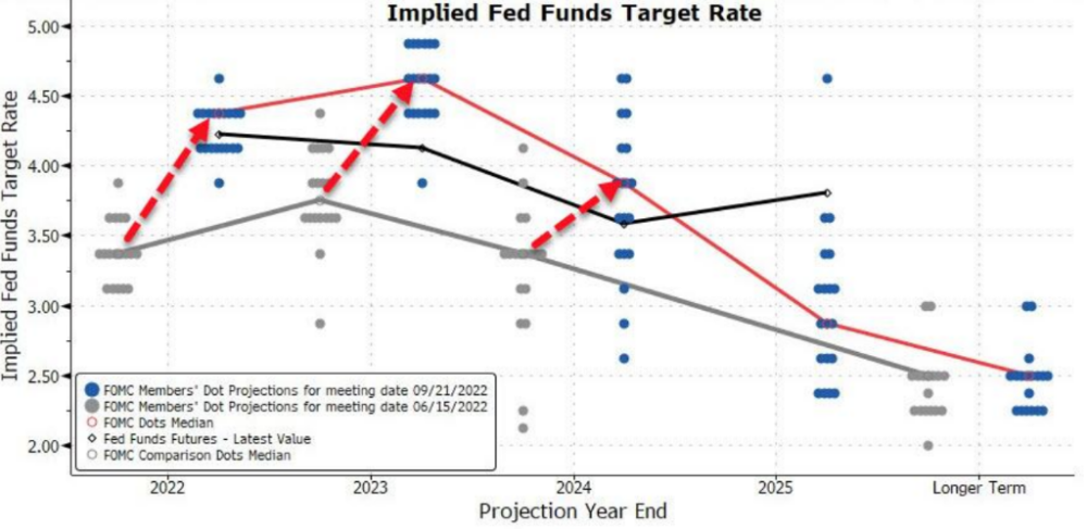 点阵图也支持了这种解释,最新点阵图显示,预期今年年内还将加息100至125个基点,年底利率中值将升至4.4%左右,较6月份预测的3.4%大幅上升,2023年将达到4.6%,体现出加息更强硬。此外,预测显示,2024年和2025年的利率中值将分别降至3.9%和2.9%。
