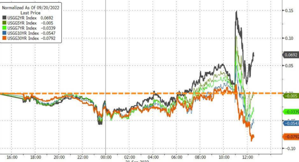 再看美债走势,短期美债收益率上行,长期美债收益率冲高后回落: