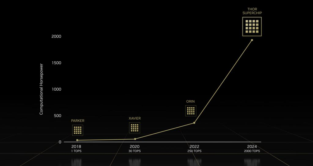 Thor SoC预计将通过770亿个晶体管提供2000 TOPS的整数计算能力以及2000 TFLOPS的浮点性能。相比之下,2016年为特斯拉AutoPilot的第2版(与Pascal GPU 组合)提供动力的Parker SoC提供了大约1个TOPS,2020年紧随其后的是提供30个TOPS的Xavier芯片。