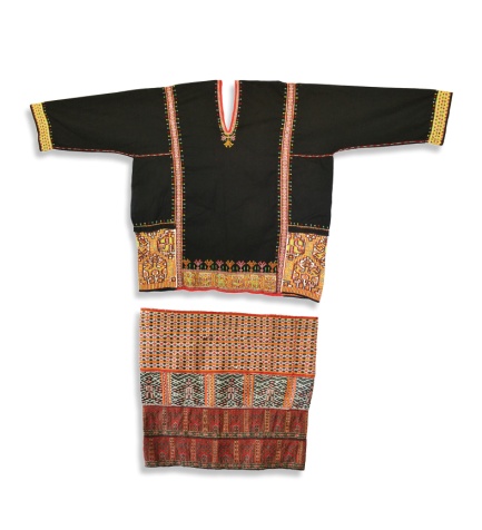 骨针新石器时代 长5.4厘米通体磨光,横断面呈椭圆形,扁方柄。石拍新石器时代 长21,宽7厘米,厚3.1厘米石拍双肩长柄,下沿圆钝,侧面有弦纹。基本认定是在黎族地区流传的古法“绩木皮为布”的工具,即与树皮布制作有关。男子树皮服装现代衣袖通长120厘米,衣长70厘米;围裙长65厘米,腰围45厘米树皮服装由箭毒树皮经过剥取、拍打、脱胶、晾晒、裁剪、缝制而成。衣身前后由四块树皮布料拼接,米黄色,对襟无纽,拼接长方领,领下缝一对麻绳为系,肩部拼接中袖,襟边和袖口包边。男子特有的下装围裙款式,用箭毒树皮打制而成的两块树皮布料拼接收于裙腰,裙腰由树皮布拼接,包边。穿着时自后向前交叠,系带固定于腰部。脚踏织机现代 长171厘米,宽125厘米脚踏织机是在踞腰织机的基础上发展演变而来。长方形,木制,由机头、综杆、踩棍、滚棍等组成。操作时采用通经断纬的方式,经牵线、装筘、挑织等工序,一升一降,投梭引纬,经线交替成为底经和面经,持续不断,便可织成黎锦。润方言妇女服饰现代衣袖通常120厘米,衣长54厘米;筒裙长39厘米,腰长76厘米上衣为贯首衣,两侧下方的双面绣,是在白色的平纹布上运用各种色线绣成正反面一模一样的图案。筒裙由裙头、裙身、裙尾三部分组成,主要图案为人纹、动物纹等。双凤日月增辉图龙被清中期长195厘米,宽122厘米龙被为三幅连缀而成,手工织绣。居中花纹图案用多种色线绣成。“卍”字连续纹带组成长方形方框,框内双凤相向太阳和白兔,白兔叼一支桂花象征月亮。双凤两侧为相向的双龙,底下为波涛汹涌的水面上有龙门和跃起两条大鲤鱼,双凤、双龙、双鱼同朝向日月。框外辅以梅花、牡丹、荷花等花卉。整幅龙被构图饱满,色彩搭配和谐。德文版《海南岛民族志》1937年长27.5厘米、宽20.2厘米、高4厘米德国学者汉斯•史图博于1931年和1932年二次在海南岛进行民族学调查,并成书《海南岛的黎族——为华南民族学研究而作》,其后翻译成日文、中文等,译作《海南岛民族志》。