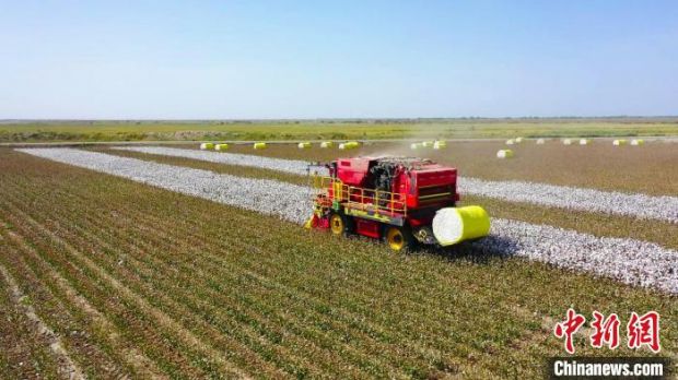 新疆阿克苏市大型采棉机在棉海里来回穿梭,经过一番“吞云吐雾”,“生产”出成型的棉包。刘兵兵 摄 走进新疆阿克苏市喀拉塔勒镇英买力村,一望无际的棉田雪白一片,一台台俗称“下蛋机”的大型采棉机在棉海里来回穿梭,经过一番“吞云吐雾”,“生产”出成型的棉包。阿克苏市棉农亚森·吐尼牙孜介绍,2022年,他家棉花地全部采用机采棉种植模式。“去年,我棉花卖了24万元,今年预计能卖出34万元。今年气候好,棉花地病虫害防治好,所以每亩产量高。”位于新疆东南部的巴音郭楞蒙古自治州(以下简称巴州),独特的地理位置和丰富的光热水土条件使得当地所产的棉花纤维长、色泽好、品质高。连日来,巴州尉犁县兴平镇统其克村的高标准棉田里机声隆隆,尉犁县投入760余台大型国产采棉机在棉田里来回穿梭,完成采摘、压缩、打包等工序。