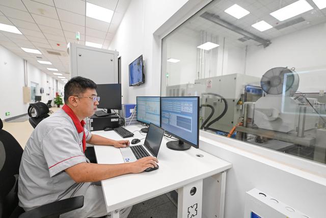 202年9月15日消息:昨日在中汽中心新能源汽车科技创新基地电驱电控部,工作人员进行电动汽车用高性能电驱动总成测试。