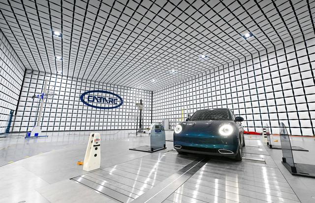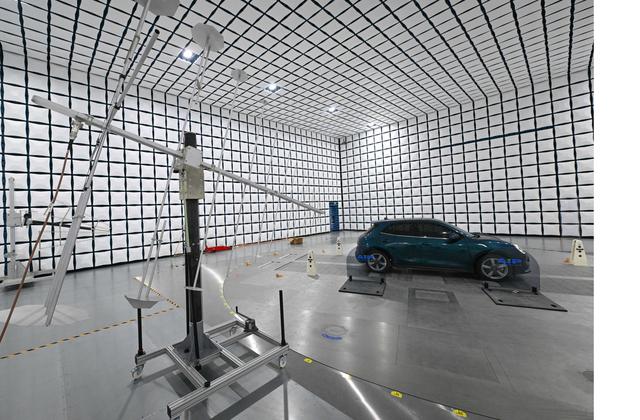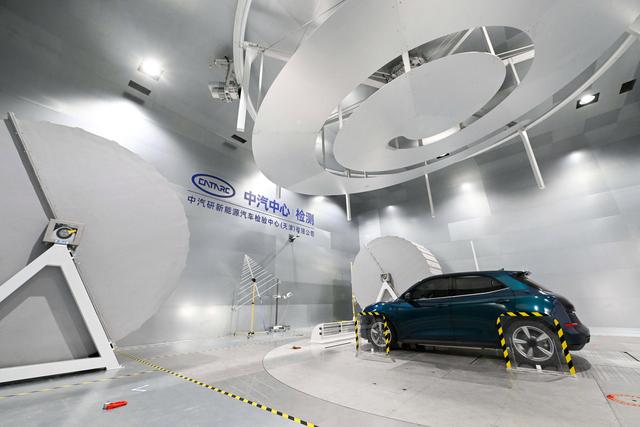 9月14日,在中汽中心新能源汽车科技创新基地电磁兼容部,新能源乘用车在接受电磁辐射水平测试。