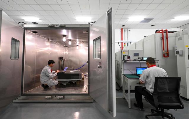 9月14日,在中汽中心新能源汽车科技创新基地电磁兼容部,新能源乘用车在混响室内接受抗电磁干扰检测。