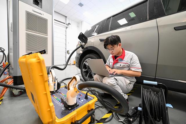 9月14日,在中汽中心新能源汽车科技创新基地充电技术部,工作人员测试某款新能源车型充电兼容性能。